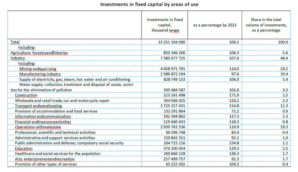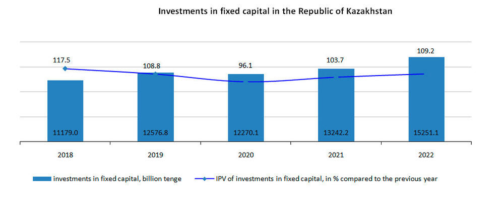 In the Republic of Kazakhstan in 2022, investments in fixed capital at the expense of all sources of financing amounted to 15251.1 billion tenge, an increase of 9.2% compared to the previous year (in comparable prices), Bureau of National Statistics reports.