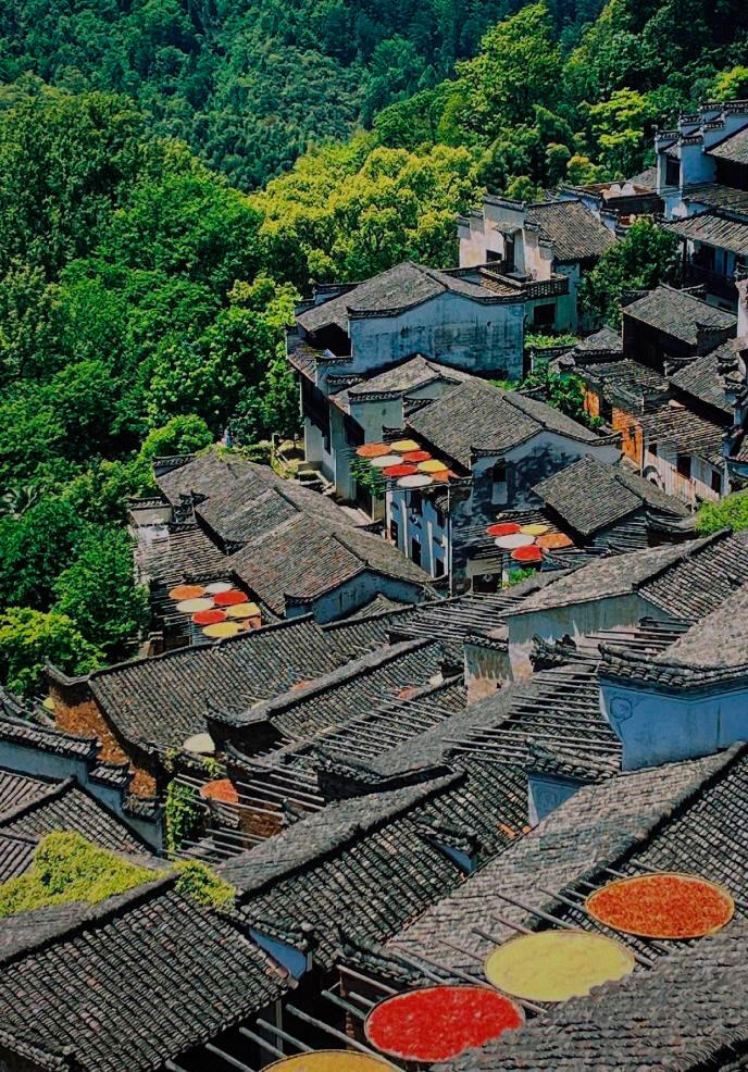 In Huangling village, Wuyuan county, east China's Jiangxi province, the local government has promoted ecological tourism development by leveraging ecological resources and other advantages, embarking on a path of integrated industrial development. Huangling is a hilly village, so villagers often dry grains on rooftops. The assorted crops drying on the round winnowing baskets resemble a series of opened umbrellas, forming a lively and pleasing scene.