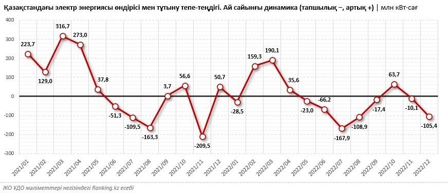 Қазақстанда электр қуатының тапшылығы мәселесі күннен-күнге өткір болып барады. 2022 жылы электр энергиясының тапшылығы 8 ай - қаңтар, мамыр, маусым, шілде, тамыз, қыркүйек, қараша, желтоқсан айларында тіркелді. Жалпы, 2022 жылдың қорытындысы бойынша, ЖО ҰДО дерегінше, электр энергиясын өндіру 112,86 млрд кВт⋅сағ құрады, бұл өткен жылмен салыстырғанда 1,4% аз; тұтыну шамамен бірдей болды, деп хабарлайды ranking.kz.