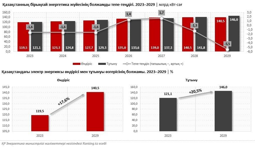 Жалпы, жеті жылда елімізде электр энергиясын тұтыну 20,5% - 121,1 млрд-тан 146 млрд кВт⋅сағ -ға дейін артады. Ал өндіріс бұл қарқындарға төтеп бере алмайды: 2029 жылмен 2023 жылды салыстырған кезде тек 17,6% көбейеді.