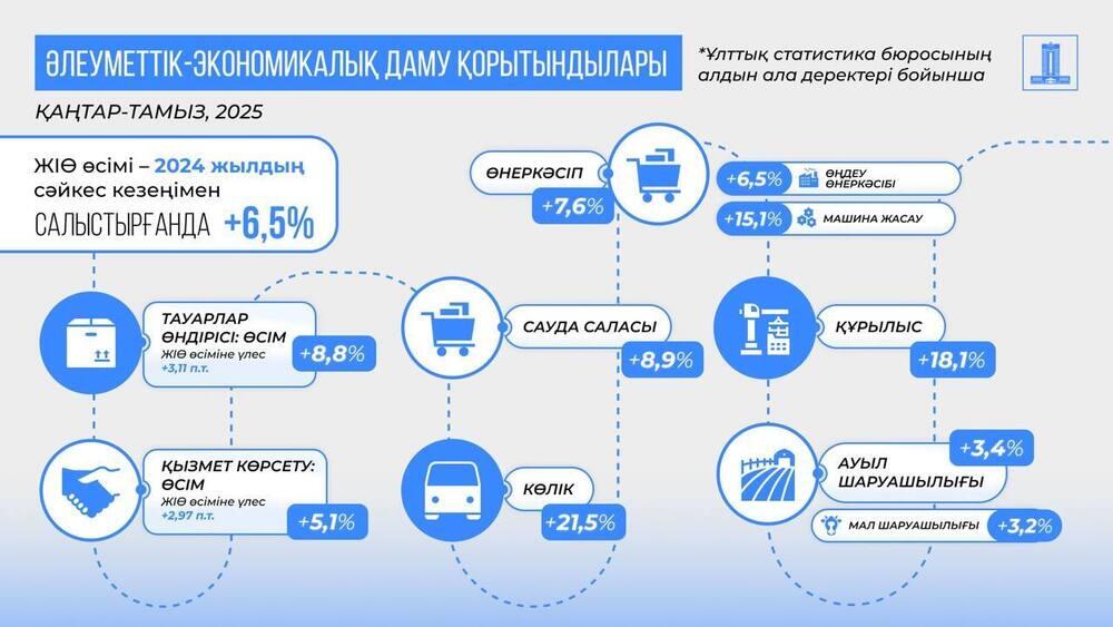 Ұлттық статистика бюросының жедел деректері бойынша, 2025 жылдың сегіз айында Қазақстанның ЖІӨ өсімі 6,5%-ды құрады, деп хабарлайды Қазақстан Республикасы Ұлттық экономика министрлігінің баспасөз қызметінен.