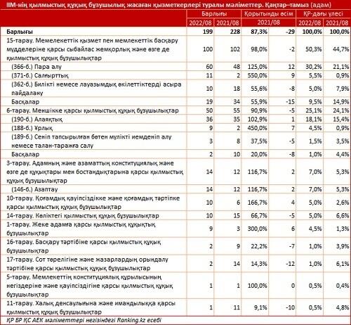 Биылғы қаңтар–тамыз айларында адамның және азаматтың конституциялық және өзге де құқықтары мен бостандықтарына қарсы қылмыстық құқық бұзушылықтарды 14 адам жасады, көрсеткіш өткен жылдың сәйкес кезеңіндегі 12 адам болған. Биылғы құқық бұзушылардың барлығы кісі азаптағаны үшін ұсталып отыр. Айтпақшы, айта кетейік, жыл сайынғы динамикада, кем дегенде, ресми деректер бойынша, 2021 жылы 8 адам азапталған. Алайда, сол жылы небәрі 8 айдың ішінде ІІМ қызметкерлерінің арасында осындай 12 құқық бұзушы бар болып шықты. Дегенмен, біз осы сегменттегі ресми статистикаға күмәндарымыз туралы бір күн бұрын жазған болатынбыз.