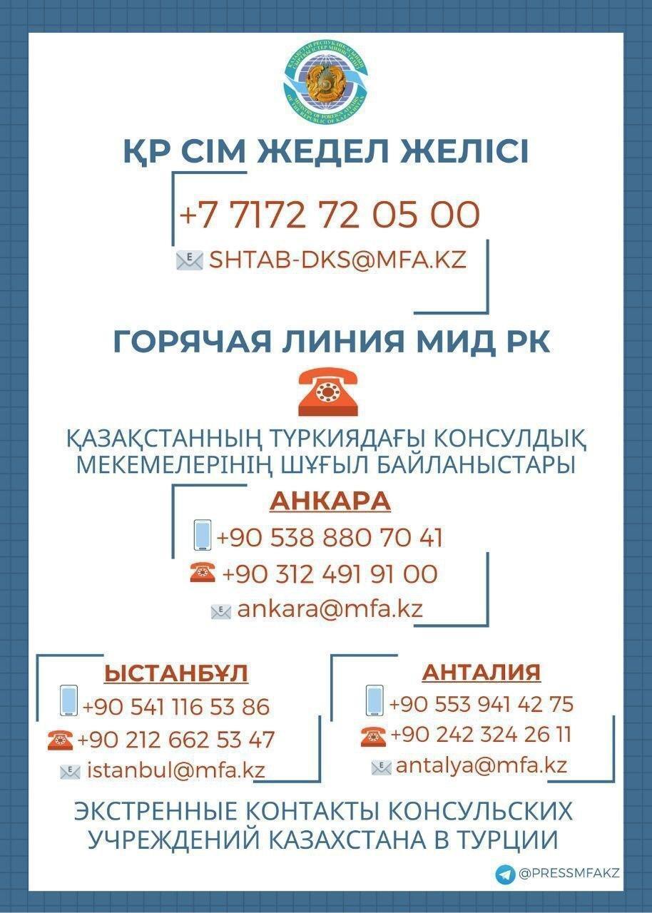 ҚР СІМ жедел желінің телефон нөмірін, сондай-ақ Түркиядағы ҚР консулдық мекемелерінің шұғыл байланыстарын жариялады.