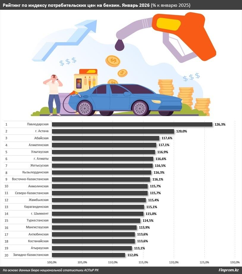 Аналитики составили рейтинг регионов РК по темпам удорожания бензина в январе текущего года. Антилидером стала Павлодарская область, где индекс потребительских цен на этот вид топлива достиг 126,3%, значительно превысив среднереспубликанский уровень. Второе место по росту цен заняла Астана: 120%. В первой пятерке также оказались Абайская (117,6%), Алматинская (117,1%) и Улытауская (116,9%) области.