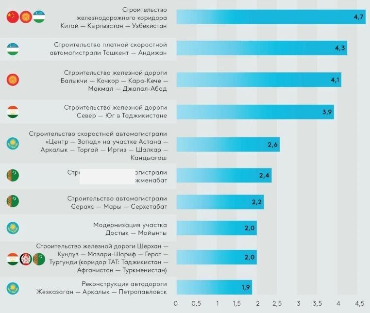 На страны Центральной Азии приходится более 22% от инвестиций, направляемых на развитие ЕТК. Осуществляются или планируются к реализации 90 проектов на общую сумму около 53 млрд долларов. Порядка 44% от этой суммы - проекты, реализуемые в Казахстане. Почти две трети инвестиций в Центральной Азии направлены на развитие сети магистральных автодорог. На 10 крупнейших проектов приходится 58% от общего объема инвестиций в развитие ЕТК в Центральной Азии", - сообщили в ЕАБР.