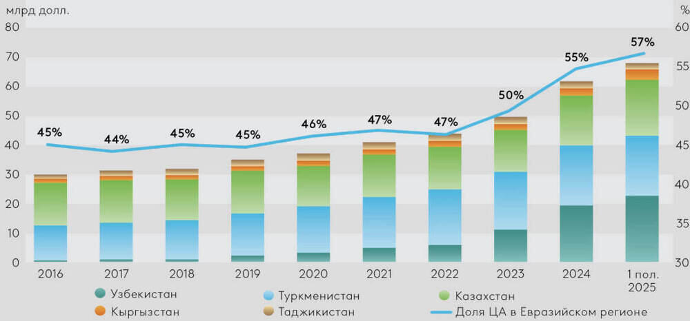 Накопленные привлеченные инвестиции из азиатских стран в экономику Центральной Азии в период с 2016 года по первое полугодие 2025 года увеличились в 2,3 раза - с $29,9 млрд до $68 млрд. По итогам первого полугодия 2025 года на Центральную Азию приходилось до 57% от общего объема накопленных прямых инвестиций, привлеченных из азиатских стран. Основной объем вложений приходится на три страны - Узбекистан, Туркменистан и Казахстан", - заявили в банка.