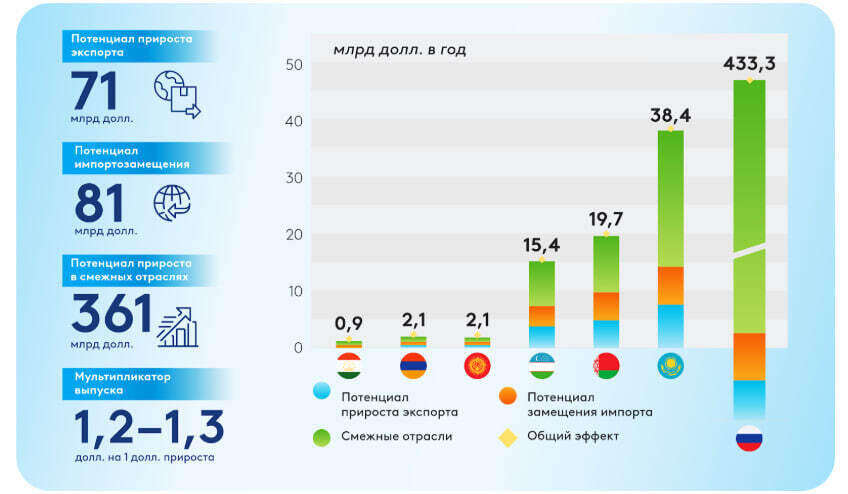 - совокупный эффект: реализация экспортного и импортозамещающего потенциала может дать более $510 млрд дополнительного выпуска ежегодно;