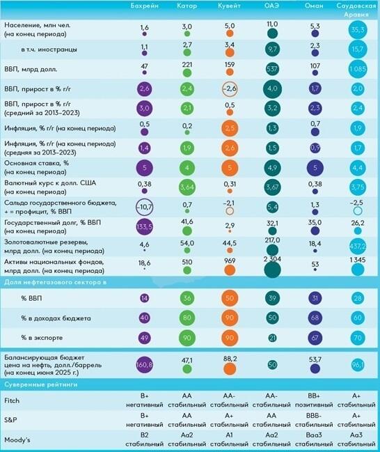 • Высокая финансовая устойчивость. Совокупные суверенные фонды превышают 5 трлн долл., а золотовалютные резервы региона (813 млрд долл.) значительно выше общепринятых норм, что позволяет странам региона сохранять стабильность даже при падении цен на нефть.