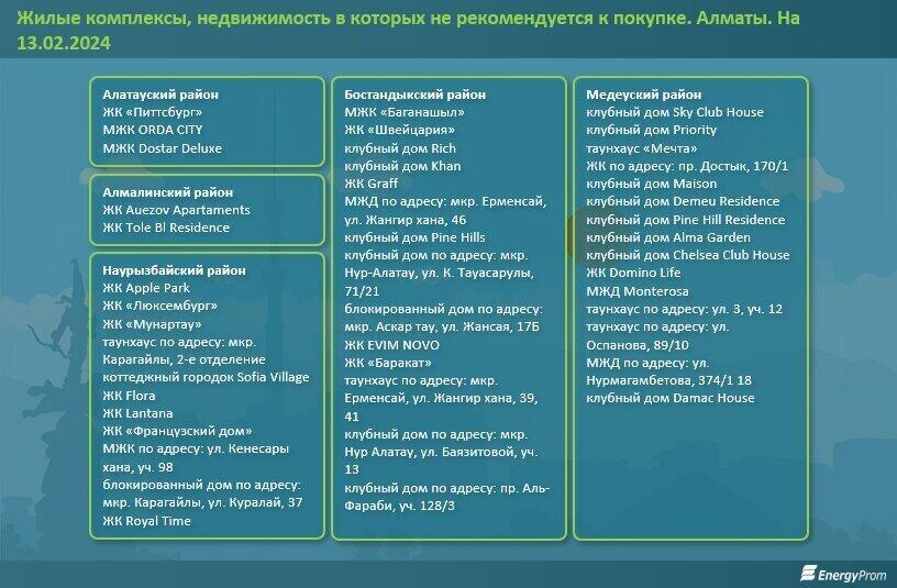 Во-первых, нужно следить за новостями акиматов городов и областей, они периодически публикуют список недобросовестных застройщиков. На постоянной основе эту практику применяют акиматы Астаны и Алматы. Одна из свежих публикаций - список алматинских ЖК, не рекомендуемых к покупке. По актуальной на 26 января 2024 года информации, в список входят 45 жилых комплексов", - сообщает сайт со ссылкой на управление градостроительного контроля Алматы.