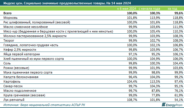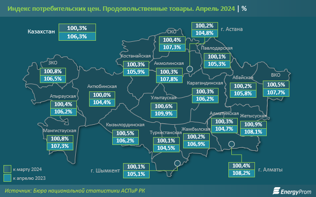 В годовой динамике наибольшее удорожание продуктов питания было зафиксировано в Улытауской области: на 9,9%. В тройке регионов-антилидеров также оказались Алматы и Жетысуская область. Наименьший годовой рост цен наблюдался в Актюбинской области: на 4,4%", - добавили аналитики.