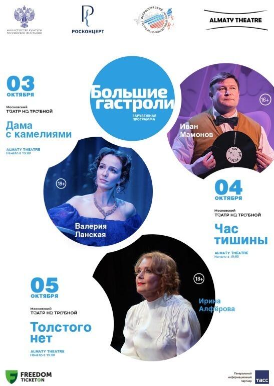 С 3 по 5 октября в Almaty Theatre состоится грандиозное театральное событие - Большие гастроли Московского Театра на Трубной, сообщает пресс-служба генерального консульства Российской Федерации.