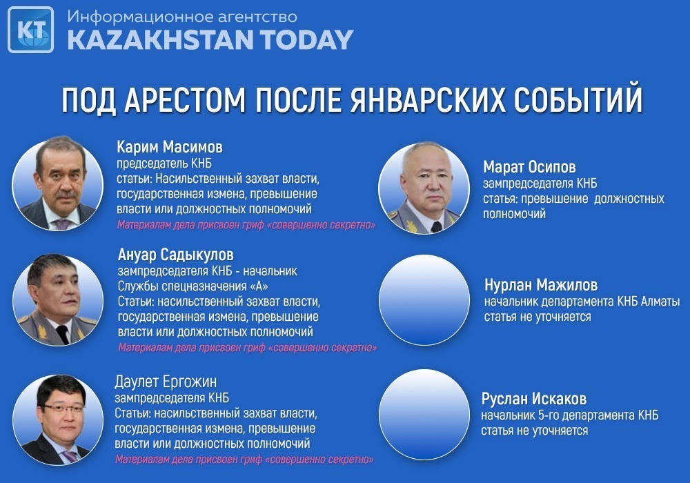 Бывший глава Комитета национальной безопасности и три его заместителя, и еще по двум руководителям: возбуждены уголовные дела по госизмене, попытке захвата власти, превышению полномочий, а также получению взятки в особо крупном размере. Бывший глава КНБ и три его заместителя арестованы", - цитирует Асылова Sputnik Казахстан.
