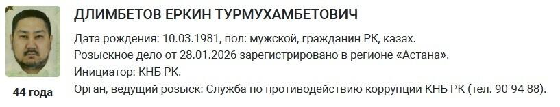 Согласно информации, Еркин Длимбетов разыскивается с 28 января 2026 года. Розыскное дело зарегистрировано в Астане.