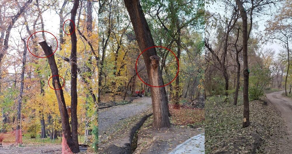 Теперь абсолютно тот же самый вандализм с 2019 года вытворяют в памятнике природы Роще Баума, в единственном месте где из-за природоохранного заповедного запрета на рубки (обрезки) были самые здоровые и крепкие деревья в городе. Вредительская губительная рубка (обрезка) лесных насаждений Рощи Баума позволяет воплотить в реальность экопреступный план "Генплана развития инфраструктуры рощи Баума"... Согласно которому в 2011 году было ложно (фиктивно) обозначено сухими 90% лесонасаждений Рощи, подлежащих проектом к рубке (сносу). Проект является сфальсифицированным, потому что сухих деревьев в таком количестве в Роще Баума в 2011 году категорически никогда не имелось, что подтверждают документальные космоснимки сервиса "Google Планета Земля", как и не имелось в 2017 году на момент незаконного изъятия Рощи у РГУ "ГРПП Иле-Алатау". После 2022 года экопреступный проект от 2011 года по уничтожению Рощи Баума по госзаказу был переиздан сельхозинститутом для придания легитимности под новой датой, но главная его цель осталась прежней - срубить (повредить) все лесные деревья Рощи Баума под любыми предлогами, с целью упразднения и утраты природоохранного статуса памятника природы ООПТ и преобразовать в обычный урбанистический парк с застройкой территории", - считают активисты.