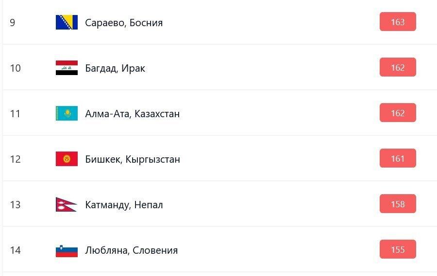 Сегодня город занимает 11-ю строчку рейтинга, опередив столицу Кыргызстана Бишкек.