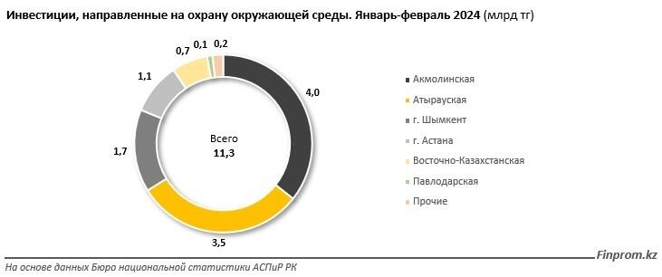 80,4% всего объема инвестиций, направленных на охрану окружающей среды, составили собственные средства предприятий: 9,1 млрд тенге - на 22,8% меньше, чем за январь-февраль 2023-го.