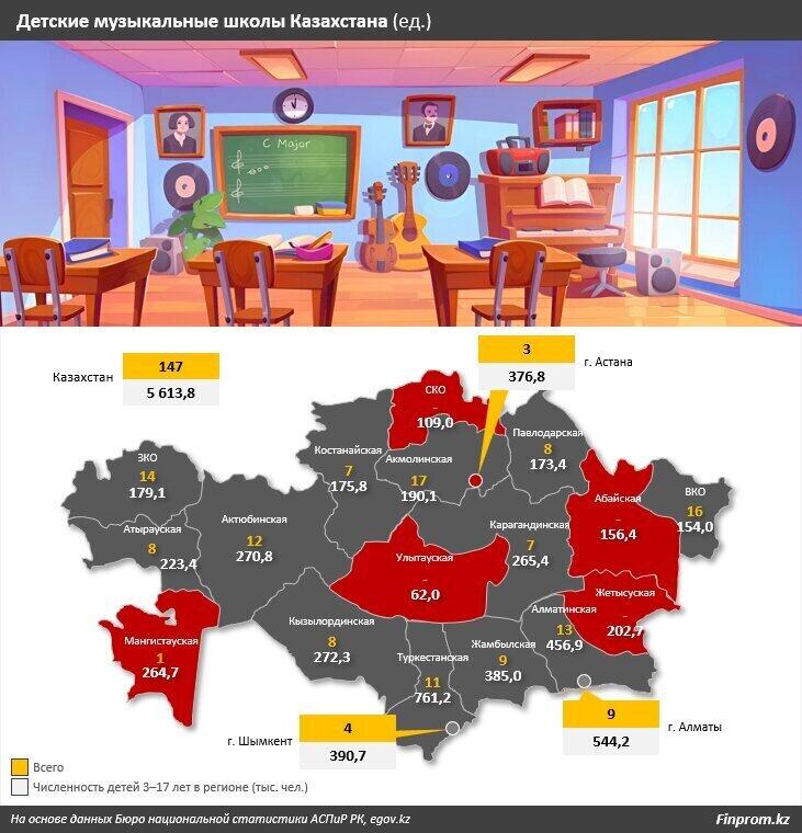 Астана. 24 июня. KAZAKHSTAN TODAY - В Казахстане на 5,6 миллиона детей от 3 до 17 лет приходится всего 147 музыкальных школ. Вклад креативной индустрии в ВВП не дотягивает и до 1%, сообщает Finprom.
