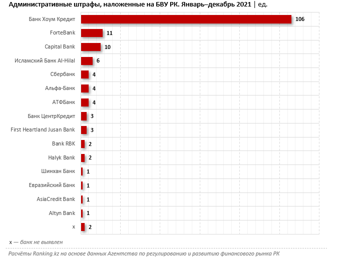 Из 161 административного штрафа, наложенного на БВУ РК за 2021 год, 106 приходится на Банк Хоум Кредит. При этом 104 штрафа - за непредоставление информации в кредитное бюро либо предоставление недостоверной информации", - говорится в обзоре.