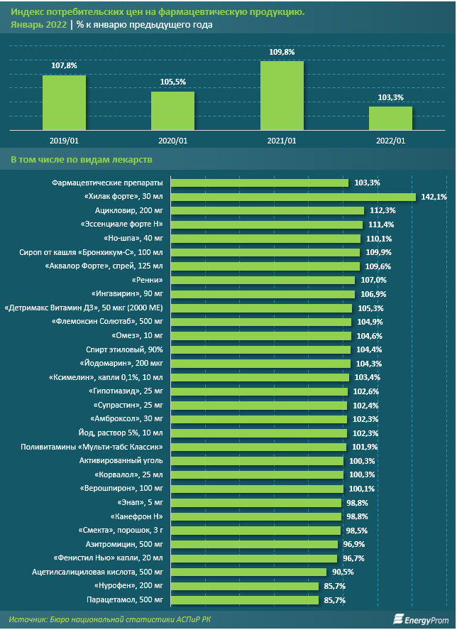 Объем производства лекарств вырос в денежном выражении на 13,8%, до 9,8 млрд тенге за январь 2022 года; прочих фармацевтических препаратов - на 37%, до 1,1 млрд тенге.