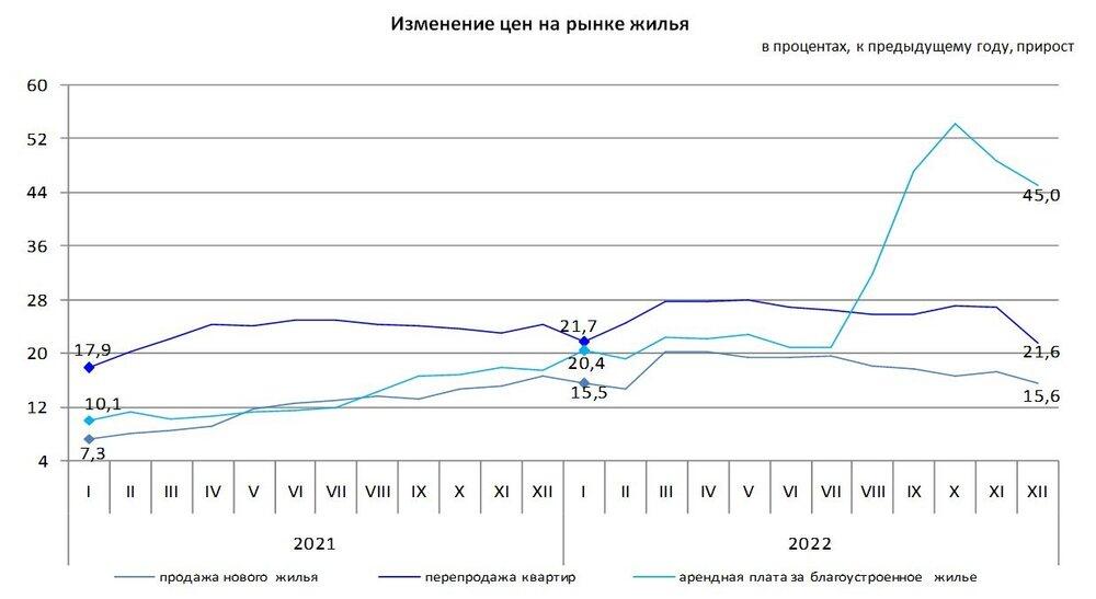 За год цены на квартиры вторичного рынка повысились на 21,6%, нового жилья - на 15,6%. Арендная плата за благоустроенное жилье в декабре 2022 года по сравнению с аналогичным месяцем предыдущего года повысилась на 45%.