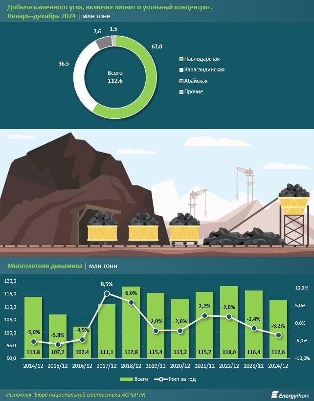 В прошлом году объем добычи составил 112,6 млн тонн - на 3,2% меньше, чем за аналогичный период 2023-го. Годом ранее уже было отмечено сокращение на 1,4%. В региональном разрезе почти 92% добычи пришлось лишь на две области - Павлодарскую (67 млн тонн) и Карагандинскую (36,5 млн тонн). Можно отметить также Абайскую область, где объем добычи каменного угля составил 7,6 млн тонн. На остальные регионы совокупно пришлось лишь 1,5 млн тонн", - сообщает сайт.