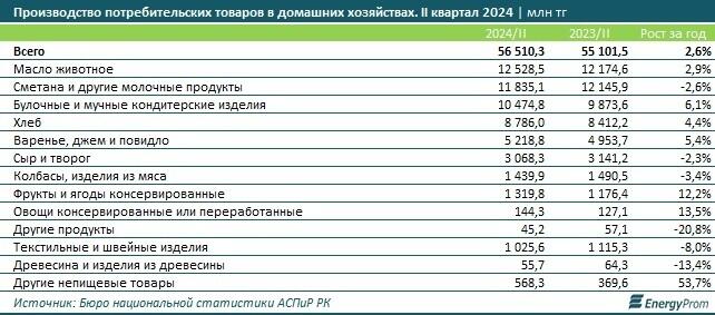 Из общего объема произведенной домашними хозяйствами продукции было продано потребительских товаров на сумму 5,2 млрд тенге. Затраты на производство составили 29 млрд тенге, увеличившись за год на 4,7%.