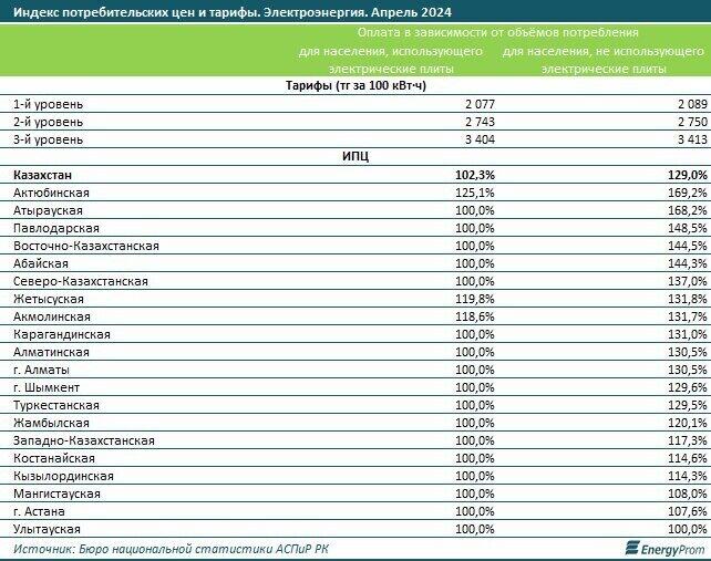 Тарифы на электроэнергию для населения, использующего электрические плиты, составили 2,1 тыс. тенге за 100 кВт.ч для первого уровня, 2,7 тыс. тенге для второго уровня и 3,4 тыс. тенге для третьего уровня потребления. Для населения, не использующего электрические плиты, тарифы составили 2,1 тыс. тенге за 100 кВт.ч для первого уровня, 2,8 тыс. тенге для второго уровня и 3,4 тыс. тенге для третьего уровня", - сообщает Energyprom.