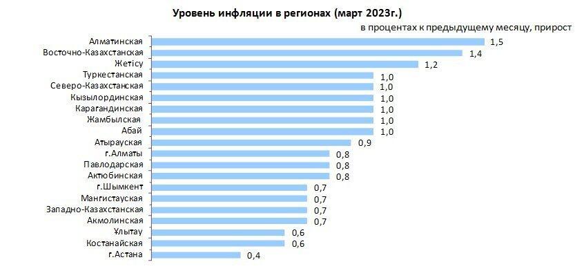 Среди регионов самая высокая месячная инфляция зарегистрирована в Алматинской области - 1,5%, самая низкая - 0,4% в Астане.