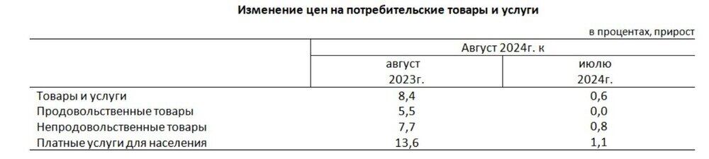 Инфляция в августе в годовом исчислении составила 8,4%. Цены на платные услуги повысились на 13,6%, непродовольственные товары - на 7,7%, продовольственные товары - на 5,5%", - пишет ведомство.