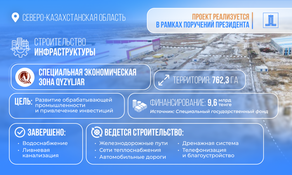 Начато строительство железнодорожных путей для субзоны №3. Одновременно ведется прокладка разводящих сетей теплоснабжения, строительство дорог, дренажной системы, линий связи и благоустройство территории. Запуск новых производств повысит промышленный потенциал и инвестиционную привлекательность региона, способствуя дальнейшему социально-экономическому развитию Северо-Казахстанской области", - добавили в пресс-службе.