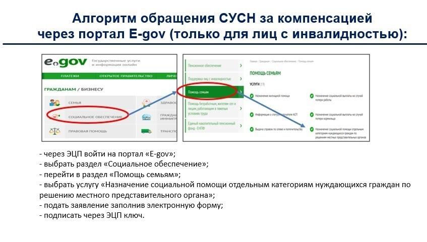 Планируется увеличить размер компенсации до 0,75 МРП, или 2769 тенге. Для ее оформления людям из категории СУСН нужно обратиться с заявлением в районные отделы занятости и социальных программ либо в дом социальных услуг. А лица с инвалидностью могут подать заявление через портал электронного правительства egov.kz при помощи ЭЦП. В разделе "Социальное обеспечение" необходимо зайти в подраздел "Помощь семьям", после чего выбрать услугу "Назначение социальной помощи отдельным категориям нуждающихся граждан по решению местного представительного органа". Срок оказания данной госуслуги составит не менее 6 рабочих дней. После рассмотрения заявлений и принятия по ним положительных решений выплаты будут осуществляться на счета заявителей в банках второго уровня", - проинформировали в акимате.