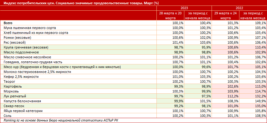 По данным ranking.kz, за четыре недели первого весеннего месяца (1-28 марта) текущего года цены сразу на семь видов социально значимых продуктов питания снизились. Речь идет о репчатом луке (минус 2,5% с начала месяца), картофеле (минус 1,1%), моркови (минус 0,1%), а также гречневой крупе (минус 4,1%), сахаре (минус 1,9%), подсолнечном масле (минус 1,2%) и мясе кур (минус 0,4%).