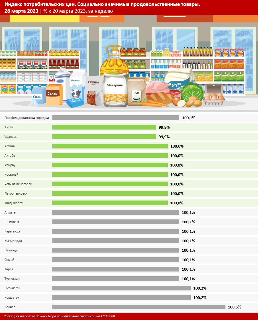 По мегаполисам и областным центрам республики ситуация такова: в двух городах цены за последнюю неделю марта снизились (в Актау и Уральске - на 0,1% за период 20-28 марта), ещё в семи - в Астане, Актобе, Атырау, Костанае, Усть-Каменогорске, Петропавловске и Талдыкоргане - остались без изменений. Примечательно, что среди регионов, где отмечено общее удешевление, находится и Мангистауская область, где ранее ситуация с ростом цен на продукты была негативной.