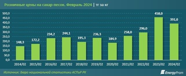 Средняя розничная цена килограмма сахара-песка при этом снизилась с 458 тенге в феврале 2023 года до 391 тенге в феврале 2024 года. Впрочем, она все еще значительно выше, чем в феврале 2022 года, когда сахар-песок в среднем по РК стоил 296 тенге за килограмм.