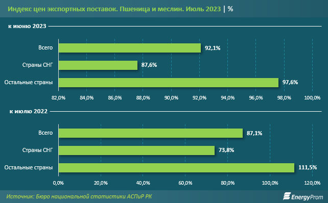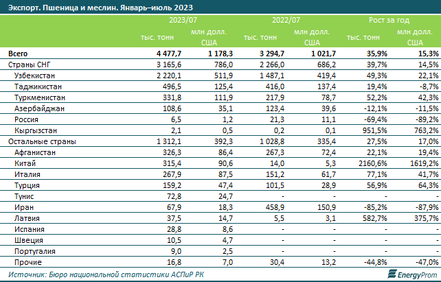 По информации аналитиков, за январь-июль текущего года Казахстан отправил на экспорт 4,5 млн тонн пшеницы и меслина на 1,2 млрд долларов. Рост в натуральном выражении составил 35,9%, однако в денежном - лишь 15,3%.