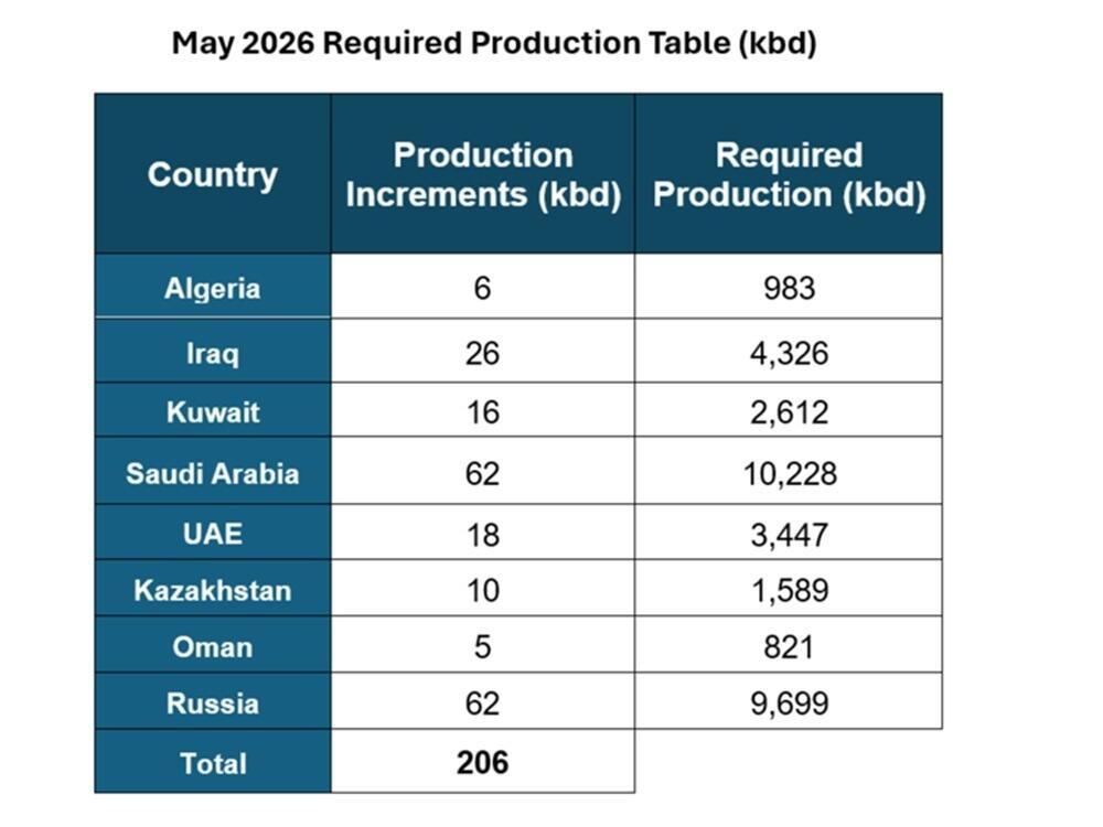 В рамках обязательств по поддержке стабильности нефтяного рынка восемь стран-участниц решили провести корректировку добычи в мае 2026 года в размере 206 тыс. баррелей в сутки из дополнительных добровольных корректировок в 1,65 млн баррелей в сутки, объявленных в апреле 2023 года. Объем в 1,65 млн баррелей в сутки может быть возвращен частично или полностью в зависимости от изменения рыночных условий и постепенно", - говорится в сообщении.