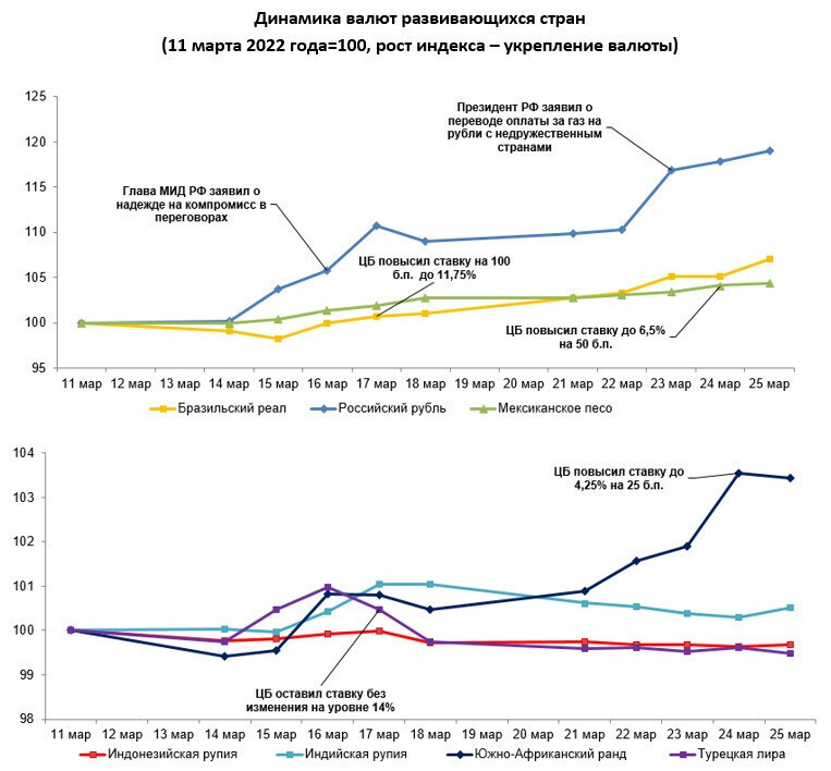 На внешнем валютном рынке в период с 11 по 25 марта 2022 года произошел ряд значимых событий. Банк Англии повысил ставку на 25 б.п. до 0,75%. Индекс деловой активности в Еврозоне замедлился в марте до 54,5 пунктов (55,5 пунктов в феврале). ФРС США по итогам заседания впервые с 2018 года приняла решение повысить ставку на 25 б.п. до 0,25-0,5%, просигнализировав, что регулятор может увеличивать ставку более, чем на четверть процента на предстоящих заседаниях в целях достижения ценовой стабильности. Прогноз большинства участников комитета по открытым рынкам предусматривает еще 6 раундов повышений до 1,75-2% в 2022 году. Комментарии Дж. Пауэлла о том, что экономика США достаточно сильна, чтобы выдержать ужесточение денежно-кредитной политики, поддержали глобальный аппетит к рисковым активам. Президент Турции Р.Эрдоган сообщил о близости РФ и Украины к консенсусу на переговорах. Эти факторы привели преимущественно к позитивной динамике валют развивающихся рынков", - сообщили в Нацбанке.