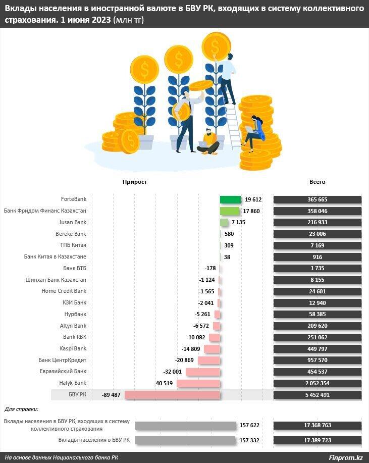 На втором месте по месячному росту инвалютных вкладов - "Банк Фридом Финанс": плюс 17,9 млрд тенге, до 358 млрд тенге. Замыкает тройку лидеров Jusan Bank: плюс 7,1 млрд тенге, до 216,9 млрд.