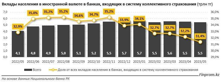 По его информации, годом ранее инвалютные розничные депозиты в банках, входящих в систему коллективного страхования, составляли 4,1 трлн тенге, или 32,9% от всего объема вкладов физлиц в этих банках.