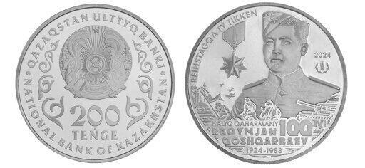 Одна из монет выпущена к 100-летию со дня рождения Рахимжана Кошкарбаева - Народного Героя Казахстана, участника Великой Отечественной войны.