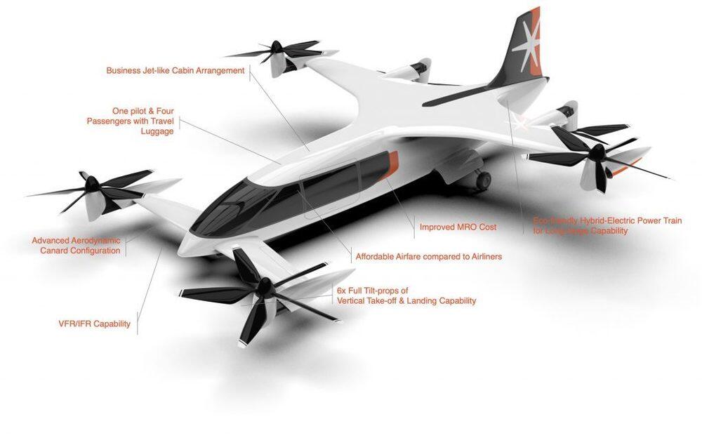 Новое гибридно-электрическое воздушное такси с системой вертикального взлета и посадки будет двигаться со скоростью до 350 км/ч, перевозя до семи пассажиров на расстояние 500 км.