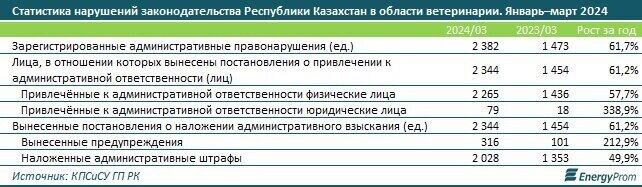 Также в январе-марте текущего года зарегистрировали 2,4 тыс. административных правонарушений в области ветеринарии - на 61,7% больше, чем годом ранее.