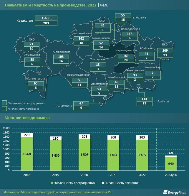 Что касается статистики погибших, то за эти годы ситуация в лучшую сторону не менялась. Ежегодно численность умерших из-за производственных травм фиксируется в пределах 200 человек. Если в 2018 году, по данным Министерства труда и соцзащиты населения РК (МТСЗН), в стране на рабочем месте погибли 220 человек, то в 2022-м - 203 человека. За январь-июнь текущего года есть данные о гибели 69 работников. С учетом погибших 17 августа в Шахтинске общая численность лишившихся жизни на работе уже составляет минимум 74 человека.