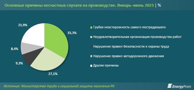 Пожар и гибель горняков в шахте "Казахстанская" напрямую связаны с нарушением промышленной безопасности. Такие предварительные выводы озвучил премьер-министр страны. К слову, почти каждый третий несчастный случай (27,1%) на предприятиях в первом полугодии текущего года произошел как раз по причине неудовлетворительной организации производства работ. Такую статистику приводит Комитет труда и социальной защиты МТСЗН. На первом же месте среди причин указывается грубая неосторожность самих работников (33,3%). Нарушение правил безопасности и охраны труда происходило в 9,3% случаев.