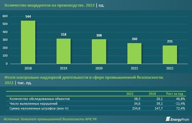 Каждый год крупные казахстанские предприятия проверяют специалисты Комитета промышленной безопасности Министерства по чрезвычайным ситуациям. К примеру, в прошлом году было проверено 38,6 тысячи объектов. Нарушения исчисляются десятками тысяч: 34,6 тысячи в 2022 году против 39,1 тысячи четырьмя годами ранее, в 2018-м (минус 11,4%).
