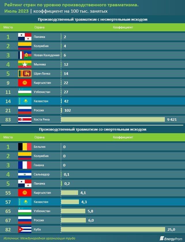 В мировом рейтинге по производственному травматизму, который ведут аналитики Международной организации труда (МОТ), Казахстан занимает далеко не лучшие позиции. Например, по количеству случаев травматизма на рабочем месте на 100 тыс. занятых наша страна находится на 14-й строчке из 83. Недалеко ушли от РК по коэффициенту производственных травм и соседние страны - Кыргызстан (9-е место), Узбекистан (11-е место), Россия (21-е место). По коэффициенту же производственных травм со смертельным исходом Казахстан занимает 57-ю строчку. Для сравнения: у РК показатель 4,3, а у лидеров рейтинга - Бельгии, Колумбии и Гвианы - 0. В таких развитых странах, как Германия, Великобритания, Швеция, Финляндия, Дания, где действуют строгие стандарты промышленной безопасности, случаи гибели людей на рабочем месте крайне редки: 1 на 100 тысяч занятых. В Нидерландах такие ситуации исключительно редки: коэффициент составляет 0,3 на 100 тысяч работников", - приводит цифры агентство.