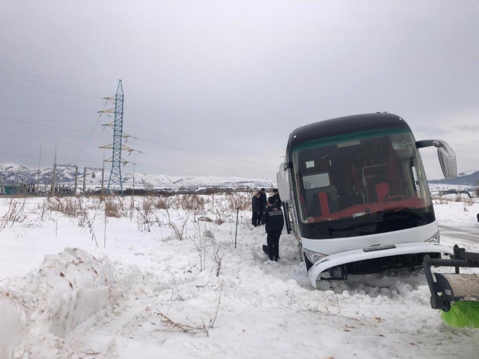 В Алматинской области из-за гололеда на обочину дороги съехал и застрял автобус с 79 детьми