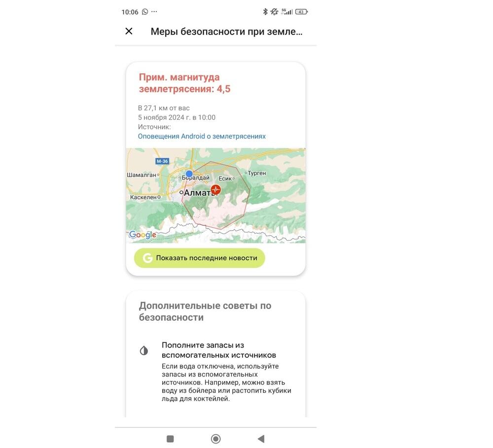 Стоит отметить, что в момент землетрясения не были включены сирены и система оповещения о землетрясении от МЧС. Между тем многие граждане получили на смартфоны оповещение Android о землетрясении.