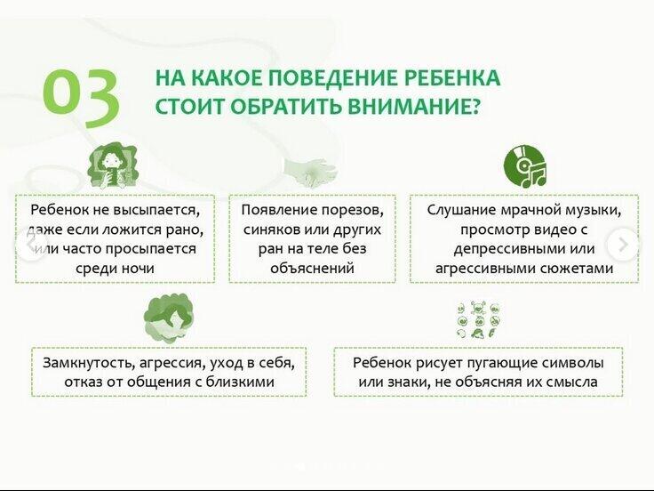 Психологи уверены: суицид можно предотвратить, если чаще разговаривать с детьми с глазу на глаз и обращать внимание на "тревожные звоночки". Родителя должно насторожить, если ребенок замыкается, не хочет общаться, не просит помощи и болезненно реагирует на обращения к нему. Они также рекомендуют установить на телефоне родительский контроль, чтобы отслеживать, какие игры скачивает ребенок, какой контент смотрит, и в каких группах состоит. Если возникло подозрение, что ребенок состоит в "группе смерти", стоит проверить, не наносил ли он себе какие-либо физические повреждения: царапины, ожоги, порезы.