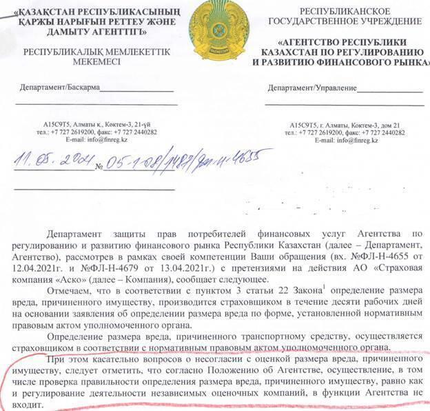 Единственным государственным органом, осуществляющим контроль за исполнением Правил, является Агентство РК по регулированию и развитию финансового рынка, правопреемник прав и обязательств Национального банка РК. Одной из ключевых задач Агентства РК по регулированию и развитию финансового рынка (далее - Агентство) является обеспечение надлежащего уровня защиты интересов потребителей финансовых услуг, полноты и доступности информации для потребителей о деятельности финансовых организаций и оказываемых ими финансовых услугах, а также повышения уровня финансовой грамотности и финансовой доступности для населения. Однако и оно заняло оборонительную позицию, отказываясь вмешиваться в ситуацию и привлекать к ответственности недобросовестных страховщиков. За 5 лет не известно ни одного случая о привлечении к ответственности какой-либо страховой компании по факту занижения размера ущерба, хотя таковые носят массовый характер. Из разъяснений Агентства следует, что определение размера вреда, причиненного транспортному средству, осуществляется страховщиком в соответствии с нормативно-правовым актом уполномоченного органа. При этом касательно вопросов о несогласии с оценкой размера вреда, причиненного имуществу, следует отметить, что согласно Положению об Агентстве осуществление, в том числе проверка правильности определения размера вреда, причиненного имуществу, равно как и регулирование деятельности независимых оценочных компаний, в функцию Агентства не входит.